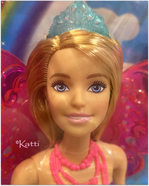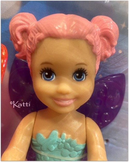 dark purple torso and a sea green flower printed skirt. Her wings are pink,