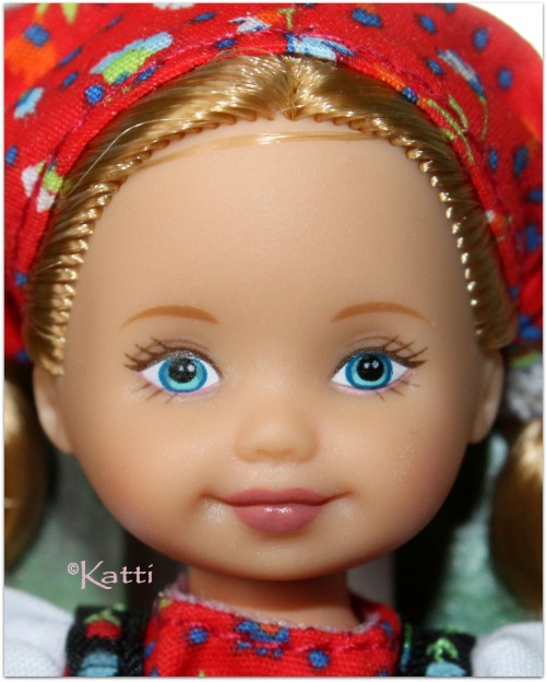 Storybook Favorites II: Hansel & Gretel, ©2000 Second set in the Storybook Favorites series was Hansel and Gretel. These are not Tommy and Kelly dressesd as, as the first set. There is nothing on the boxes saying they are anything but the storybook characters. Hansel is wearing a pair of brown lederhosen over a green and white gingham shirt, beige socks and black shoes. His hat is made of brown felt with a feather on top. Gretel has two long golden braids under her red flower printed bandana/shawl with lace edge. She has a red dress in the same fabris with a white apron, blue socks and a pair of black Mary Janes. She also carries a basket filled with bread.Both dolls have the Kelly closed mouth sculpt. More and detailed photos in my (Swedish) blog. © Dolls and photos all belong to me, unless otherwise noted.