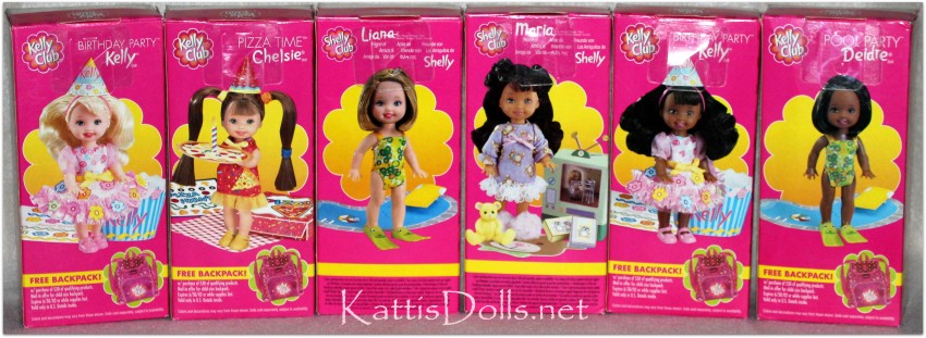 Kelly Club: Party! / Shelly Club 2001-1 Party! was the theme for 2002's first batch (©2001). We have a birthday party, a pizza party, all with party hats, a pool party and a pajama party. European (and most likely Canadian) dolls have no "party" printed. There were a total of six dolls, of which Liana and Deidre came with a variation. Not a big one, but still. Their spring green bath robes came with or without a yellow satin ribbon to tie around the neck. Kelly came as CC and AA and she stood in a cardboard cup cake with her frilly birthday dress. Chelsie's dress had pizza print and Maria's night gown had fuzzy bears printed all over. More and detailed photos in my (Swedish) blog. © Dolls and photos all belong to me, unless otherwise noted.
