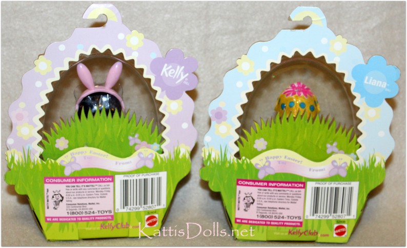 Kelly: Easter Eggie ©2001 Target released four "new" dolls for easter 2002. We saw Kelly in two skintones, dressed up in a pink rabbit suit with a plastic bunny ear diadem/head piece, Melody was a dressed in a fluffy lamb suit with black hanging ears and Liana was dressed as an Easter Egg (Li'l Egg) in bright colors and fun pattern. I didn't buy two of these myself, for different reasons, mostly because the rabbits were almost the same dolls as in the Easterrific series. The lamb was re-released in the Easter Garden set and I bought that one so I felt I didn't need them again. Kind of stupid as they are slightly different. The Easterrific dolls have bangs, Easter Eggie doesn't, and white in the ears of the head piece and their eyes are different. Oh, well. The things you realize in hindsight. More and detailed photos in my (Swedish) blog. © Dolls and photos all belong to me, unless otherwise noted.