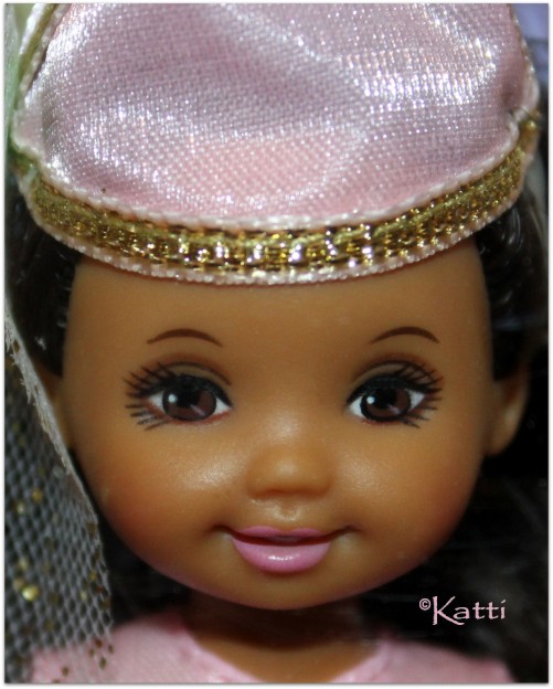 Kelly/Shelly: Rapunzel ©2001 Rapunzel made it into the line of Barbie movies and we got a set of Kelly dolls along with it. Kelly as the Petal Princess in pink gown and a princess hat witrh veil. Tommy as a Li'l Prince in blue satin with gold decorations. Maura (Lorena in the US) in red hair in two buns ontop of her hair and dressed in a blue/green gown and a big decoration at her back, looking like the tail feathers of a peacock. Melody in white have wings on her back and a gloria above her head as she is an angel. More and detailed photos in my (Swedish) blog. © Dolls and photos all belong to me, unless otherwise noted.