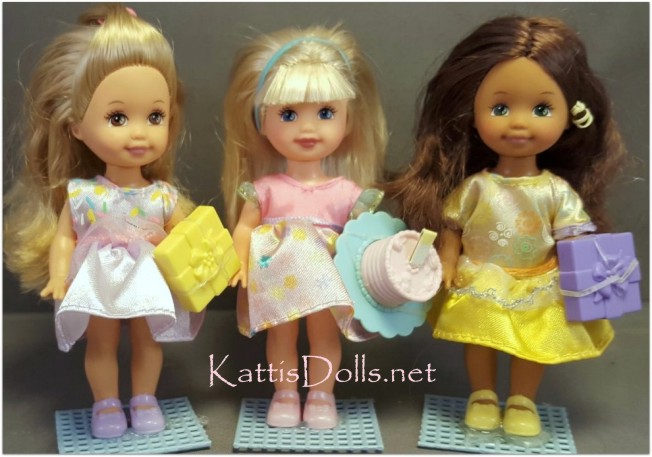 Kelly/Shelly: Birthday Party ©2005 Birthday Party of 2006(?), with ©2005 consists of three girls in their party best. Flowers and frills. Kelly is wearing a pink dress with green frills as "sleeves". The bodice is pink and skirt flower printed. She comes with a birthday cake on a tray. Kerstis is adorable with glonden blonde hair and brown eyes. She wears a dress in lilac, with the flower print in the top while her skirt is lilac satin with a tulle overskirt. Keeys is wearing a yellow dress with short pofy sleeves. Kerstie and Keeya come bearing gifts. More and detailed photos in my (Swedish) blog. © Dolls and photos all belong to me, unless otherwise noted.