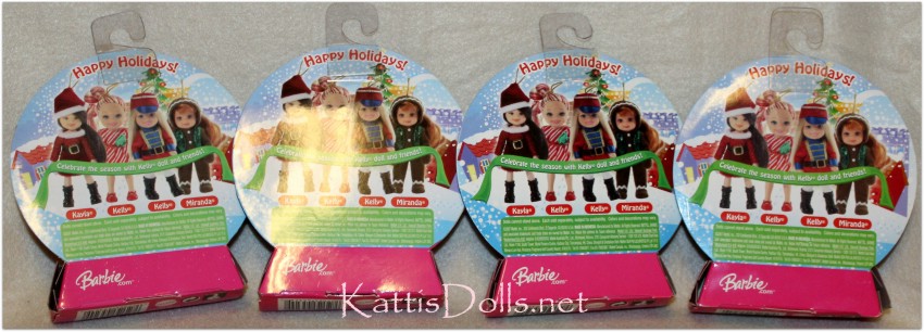 Kelly: Happy Holidays! - I'm an Ornament! ©2007 As I am typing this, I am uncertain these are Target, but I guess they are. Happy Holidays! for 2008 consists of four girls in half ball boxes - half an ornament. We have two Kelly dolls, one Kayla and one Miranda al decked upp in holiday costumes with a gold string so they can be used as christmas ornaments, should you so wish. Kelly is a peppermint and a toy soldier, Miranda is a gingerbread and Kayla dressed as an elf - or Santa's helper in red velvet skirt and hat. More and detailed photos in my (Swedish) blog. © Dolls and photos all belong to me, unless otherwise noted.