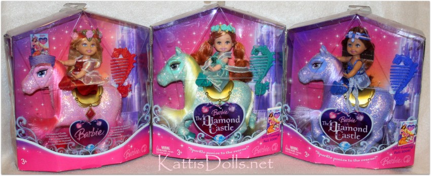 Kelly The Diamond Castle ©2008 Kelly is a princess with a sparkly pony in this series, from the Barbie movie The Diamond Castle. The ponies match their riders in their weird colorings and glittery hide. All that glitter. It gets everywhere. As usual. The European boxes doesn't say Shelly, but as the US ones say Kelly, she will be called Shelly anyway. "She" is the blonde doll in her red dress on a pink pony. The other two are US editions, the redhead in a green dress on a green pony and the brunette/AA in blue dress on her blue pony. These come in Caucasian and AA versions from what I understand. "Sparkle ponies to the rescue!" More and detailed photos in my (Swedish) blog. © Dolls and photos all belong to me, unless otherwise noted.