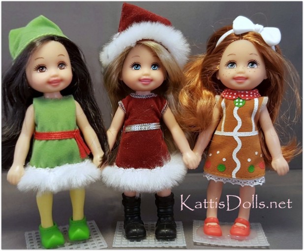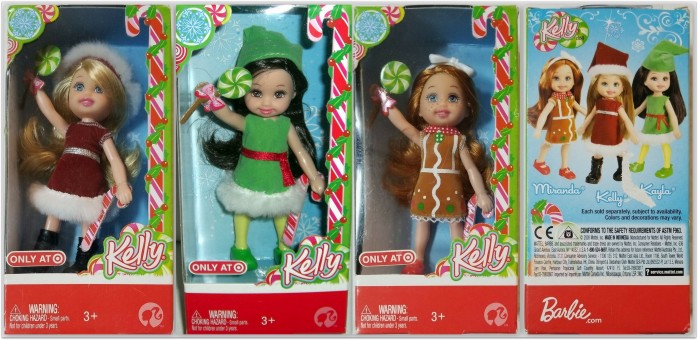 Kelly: Holiday (Target) ©2008 Target had three dolls in their Holiday set for 2009 (©2008). We had Kelly wearing a rich red velvet dress and santa hat, both trimmed in white fur, Kayla in a green fur trimmed elf dress and hat and Miranda wearing a gingerbread dress and a white bow diadem in her red hair. All the girls carry a lollipop and candy cane printed on cardboard. More and detailed photos in my (Swedish) blog. © Dolls and photos all belong to me, unless otherwise noted.
