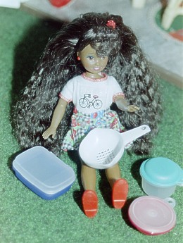 | To the left is a container from Tupperware (magnet), to the right is a Barbie© mixer and on the stove you can see pots and pans from Tyco's Kitchen Littles and a copperpan that is a dollhouse miniature. The cokebottle is from a Barbie© accessory-set. | |