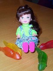 on Christie's bed in the dollhouse. Christie's cat laid down right