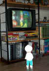 Seamus just stopped to look when this character showed up on the TV-screen. This is Bolibompa, the mascot of Swedish Childrens' television programs. |