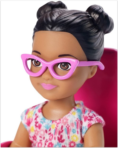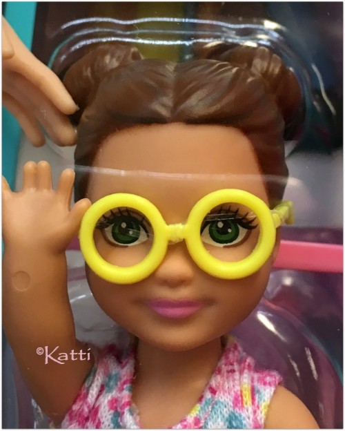Barbie Eye Doctor ©2014. Barbie is an Eye Doctor in this set and come as Caucasian (Millie) or AA (Nikki). Barbie wears a dress in black and teal with a doctor's jacket in white. Her shoes are black high heels. The girl has two top buns, the CC/latina version has brown hair and green eyes, the AA girl has black hair and brown eyes. The dress is a multicolor sleeveless cotton dress with a flairing skirt. The high sneakers are a light coral pink. More and detailed photos in my (Swedish) blog. © Dolls and photos all belong to me, unless otherwise noted. - |