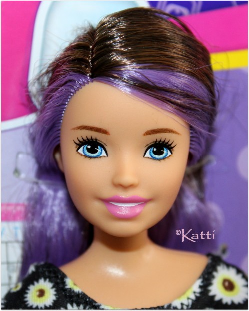 version with a big smile and brown hair with a purple streak and blue eyes.