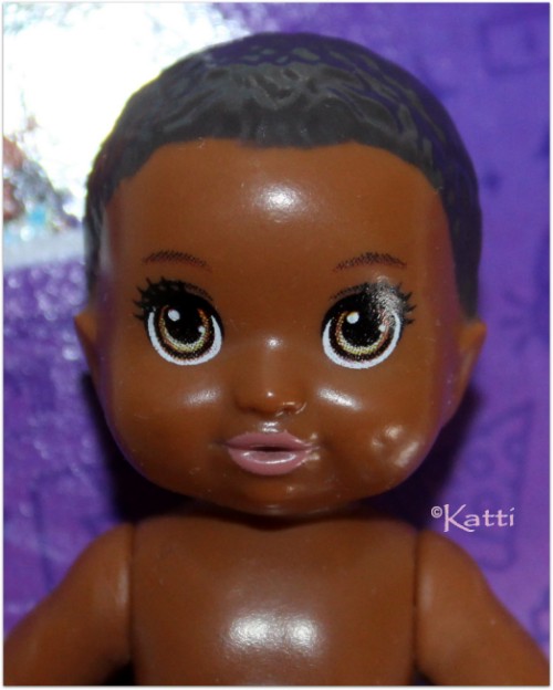 baby sibling has black curly hair and light turqouise diapers. They both