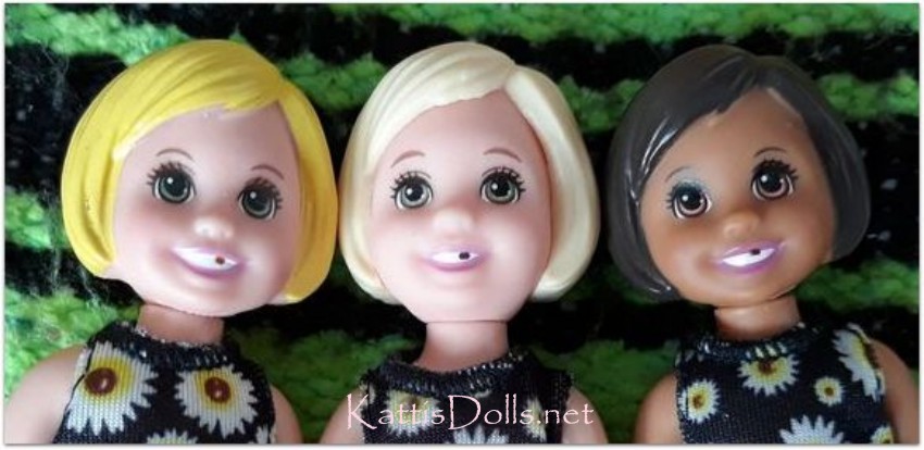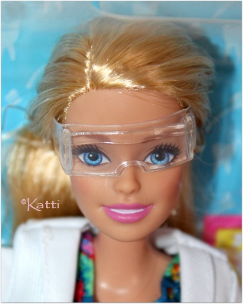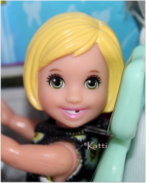 Dentist Barbie ©2019 Dentist seems to be a coveted job in the USA as Barbie has been one so many times. Doctor, Teacher or Dentist. Most common occupations. Anyway. This set come in two versions but has also been released a couple of times as the little blonde patient changed the color of her hair - or if that is just the manufacturing plant. However, her head sculpt changes from the one with molded-hair-in-one to the "wigged" head as well. To that note. The girl has the Bob Cut hairdo in blonde (lemon or vanilla) and green eyes or brown with brown eyes and she is missing a tooth. The dress is black with sunflowerprints and she wear white toddler boots. Barbie is a blonde and blue eyed Millie or black haired with brown eyes Lea. The clothes are a royal blue dress with flower print in many colors under a doctor's robe. Barbie wears a pair och black strap heels. Promo/product photos shows the shoes to be a pair of plain black pumps, but that changed to production. More and detailed photos in my (Swedish) blog. © Dolls and photos all belong to me, unless otherwise noted. - |