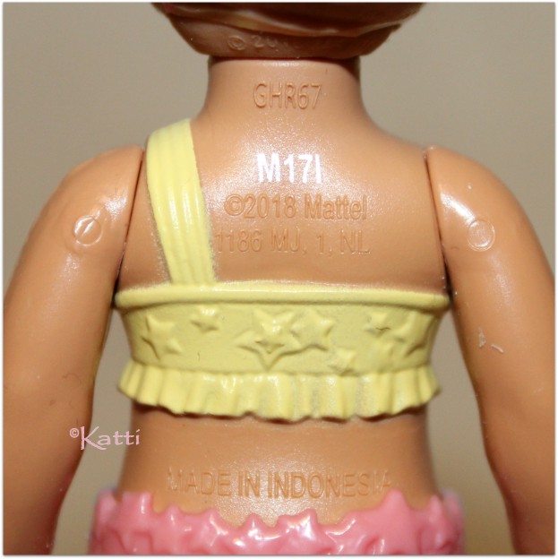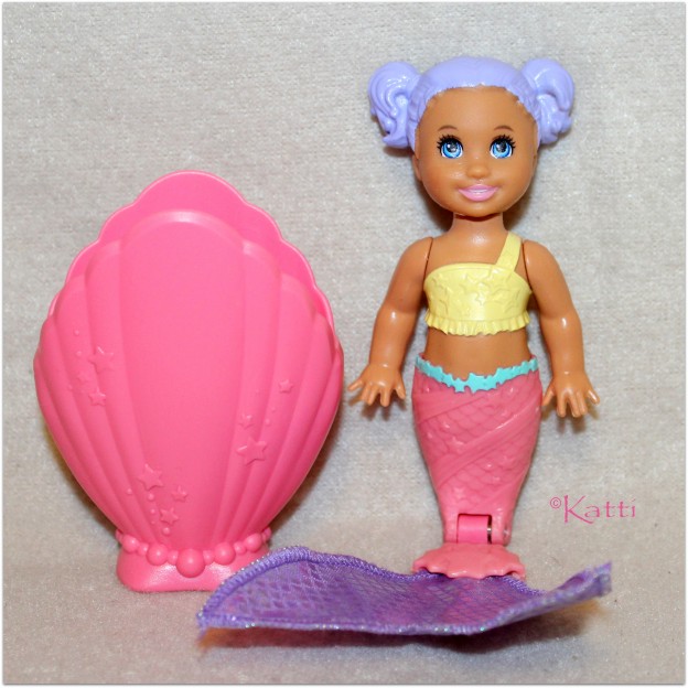 Dreamtopia Surprise Mermaid ©2019 I only have one of these dolls on hand so I can't share much about them, other than these are a bunch of Mermaids sold in a closed box, so which you get is a surprise. Also. This was before we had all kind of numbers/codes to go by and the people that invest time and energy in that, wasn't around when these came by - or interested. The boxes might be marked according to content, but yet again. I have no clue. With one box - box gone and can't find any photos of it (yet), I can't tell what is on them. What I can say is this: The dolls come in one of four different looks of body/tail and same count of heads, but in more colorings making up at least six different versions; there are six official pictures of the mermaid kids. Each body style is painted the same with a variation in two of them, but the fin and shell come in random colors. Maybe the head too, but I am not certain about that part. The pictures I have seen has been the same heads/colors on the same type of body/color. Coinsidence? No idea. I randomly numbered them according to the item number I have found (which I also cannot say if they are accurat or not..). A lot of I-don't-knows here. But it is what it is. More and detailed photos in my (Swedish) blog. © Dolls and photos all belong to me, unless otherwise noted.