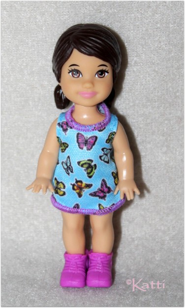 She wears a blue dress with butterfly prints and bright purple toddler boots.